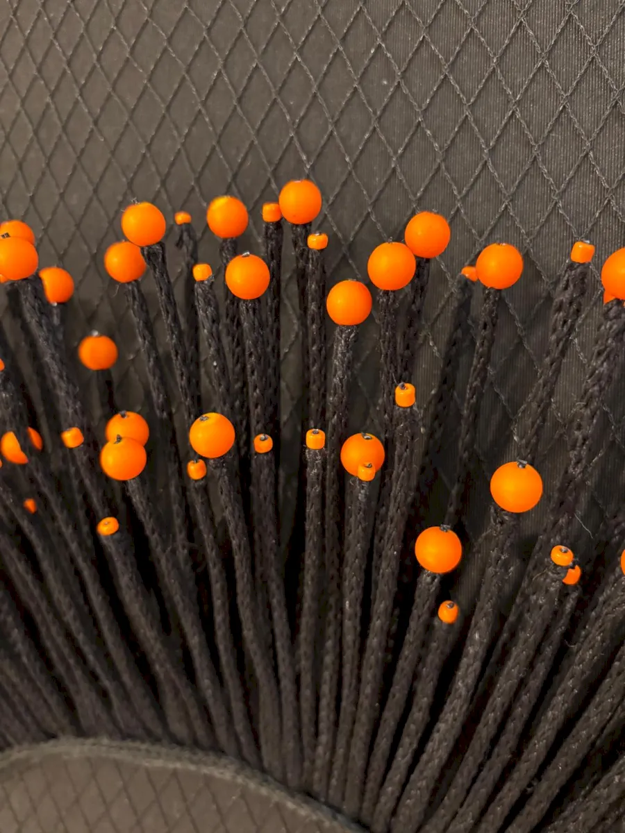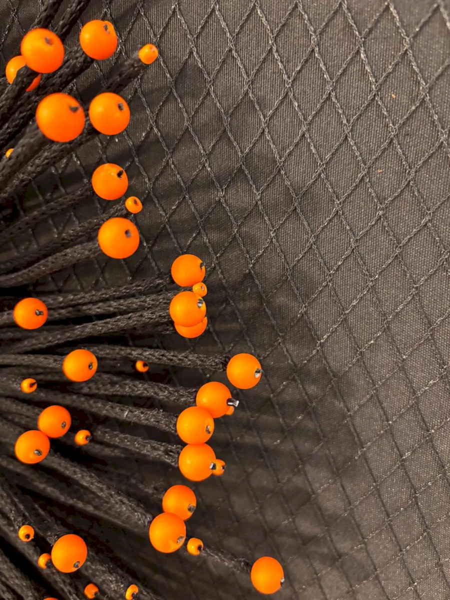 Fine metallic threads and hand-stitched orange stones suggest drops of juice, symbolising vitality and origin.