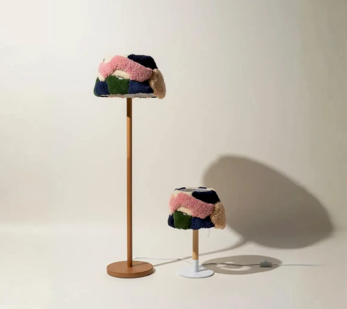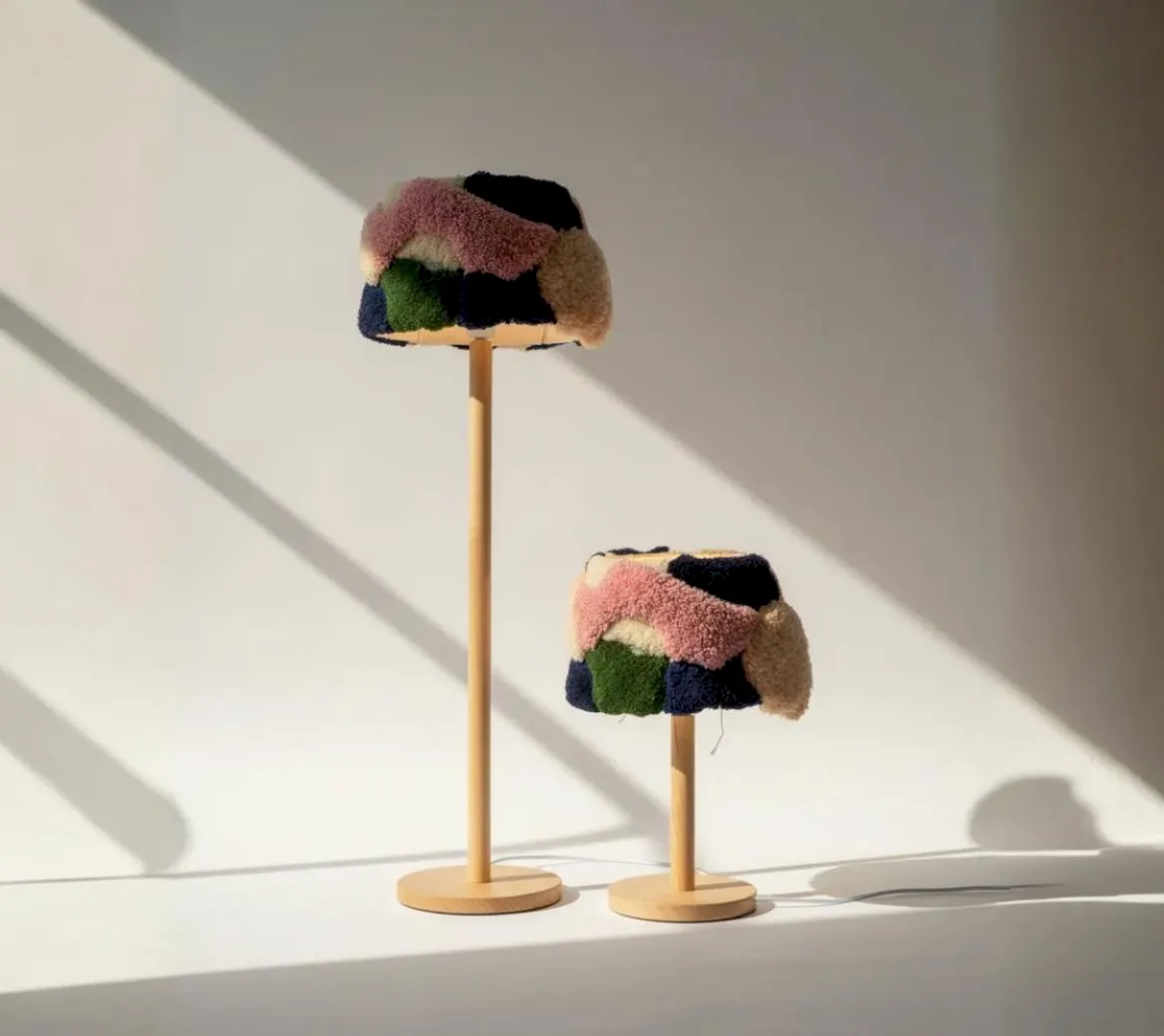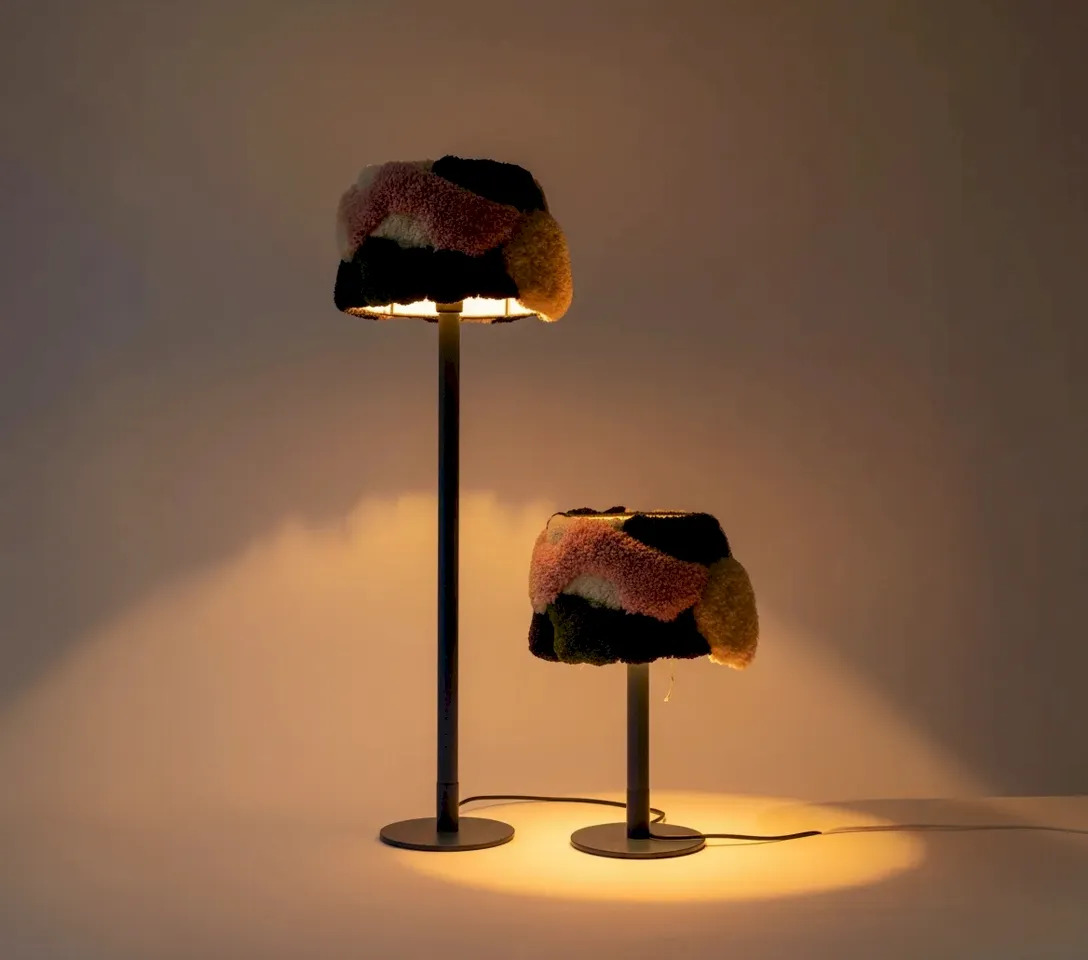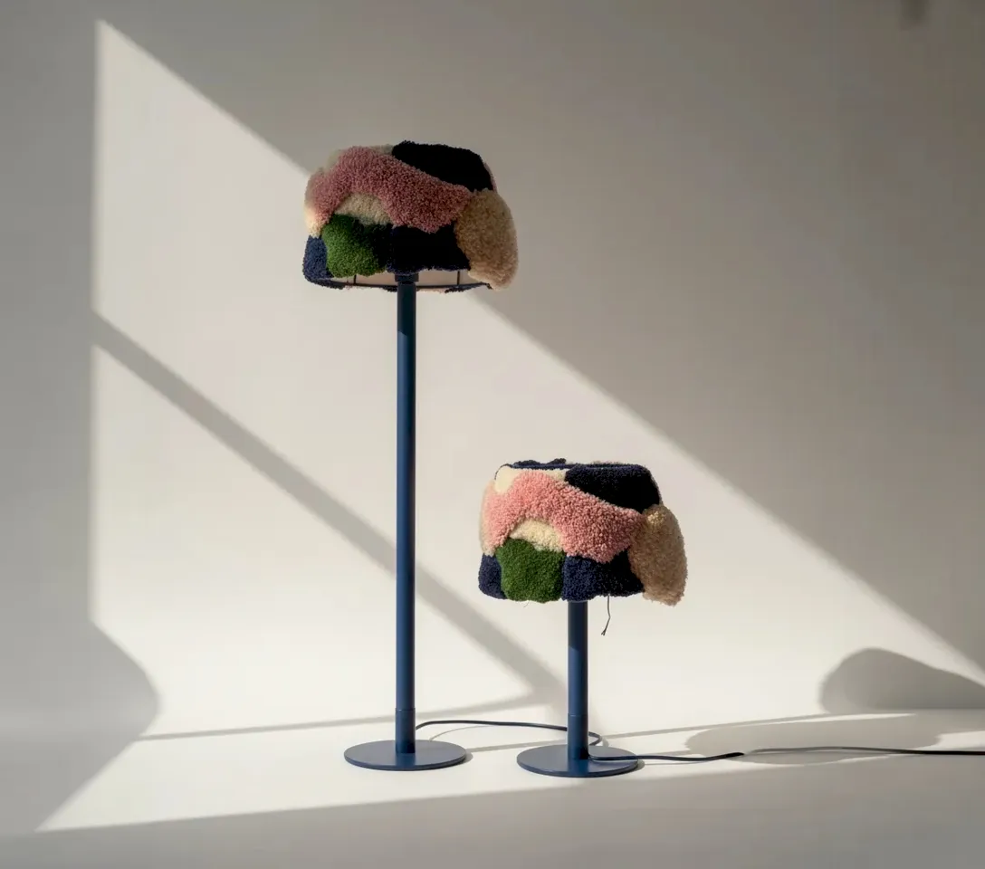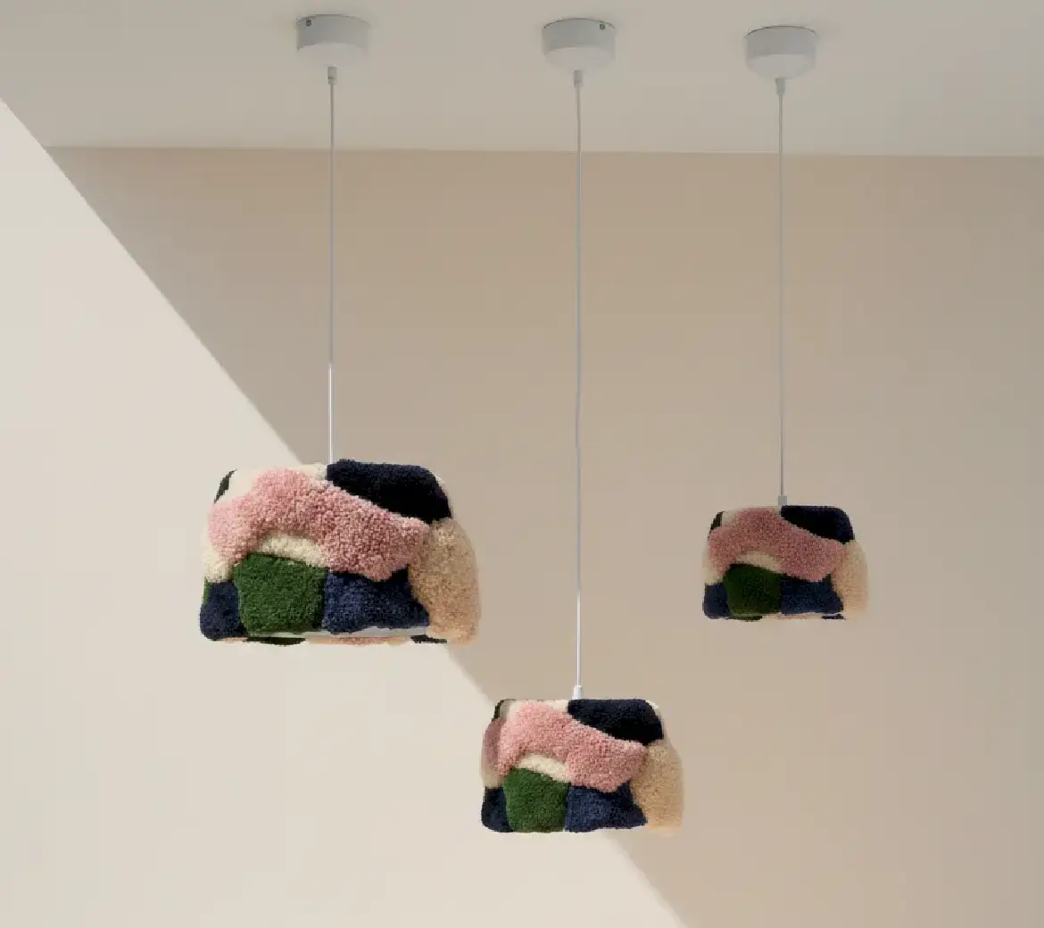 Pendant lamp with hand-tufted textile shade featuring organic color-block composition. Irregular sculptural form that becomes a visual statement even when unlit. The textile surface is crafted with distinct color zones—blush pink, deep navy, forest green, natural beige, and black—creating an abstract landscape effect. When illuminated, light diffuses through the varied fiber densities, producing subtle luminous patterns and warm ambient glow. The hand-worked texture adds depth and visual richness from every angle. Ideal for dining areas, reading corners, bedroom lighting, boutique hotel lobbies, or commercial spaces seeking distinctive ambient illumination with artistic presence.